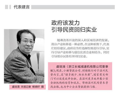 虞總建言:現(xiàn)在,小額貸款公司、村鎮(zhèn)銀行對(duì)于溫州民資而言,是“僧多粥少、杯水車薪”,國(guó)家有關(guān)部門可以適度放開(kāi)金融,在溫州更多地開(kāi)展小型金融機(jī)構(gòu)的培育和試點(diǎn),幫助溫州民間資本尋找出路,也為中小企業(yè)貸款提供門路。