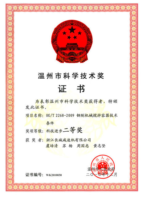 化工行業(yè)標(biāo)準(zhǔn)HG/T 2268-2009《鋼制機(jī)械攪拌容器技術(shù)條件》溫州市科學(xué)技術(shù)二等獎證書