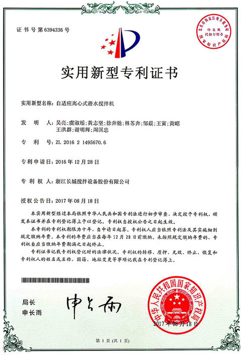 熱烈祝賀我司“自適應(yīng)離心式潛水?dāng)嚢铏C”獲國家實用新型專利