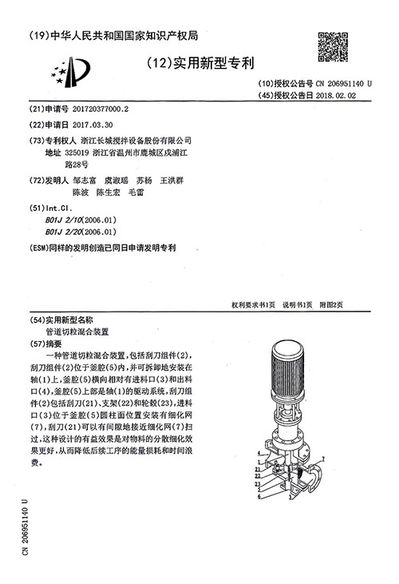 熱烈祝賀我司“管道切粒混合裝置”獲國(guó)家實(shí)用新型專利